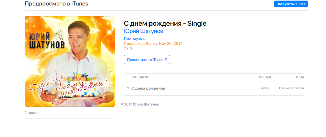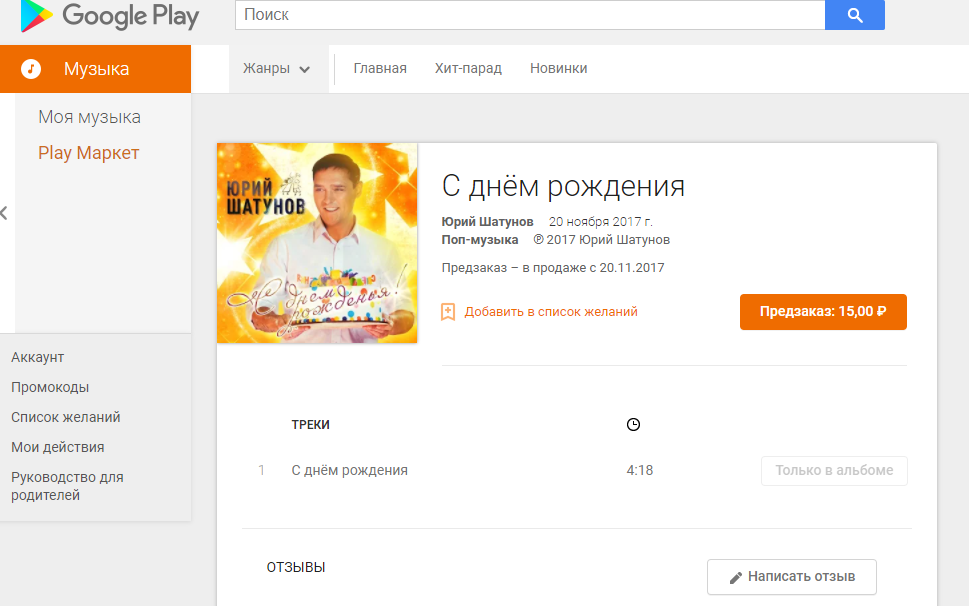 Зашла я в Play Маркет (Google Play), в поиске ввела "Юрий Шатунов - С днем рождения" и, под обложкой сингла, нажала "Сделать предзаказ". Для того, чтобы сделать его, необходимо иметь дебетовую карту. Если ее нет, надо ее приобрести, а сделать это можно в сбербанке. У меня например банковская карта VISA, можно через Maestro, не имеет значения. Нажимаешь "сделать предзаказ", далее вводишь данные своей карты, там указано что нужно вписывать, и далее нажимаешь - купить.