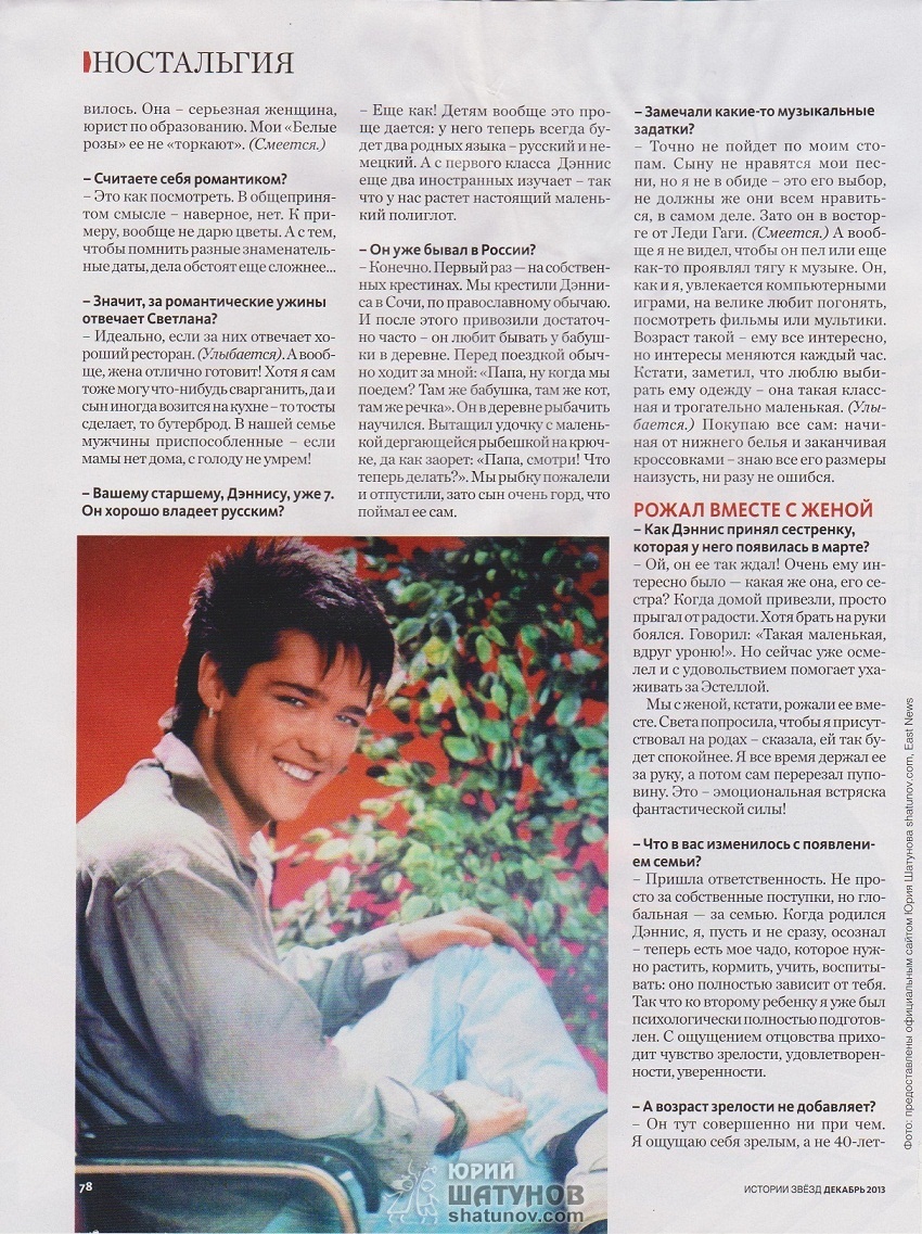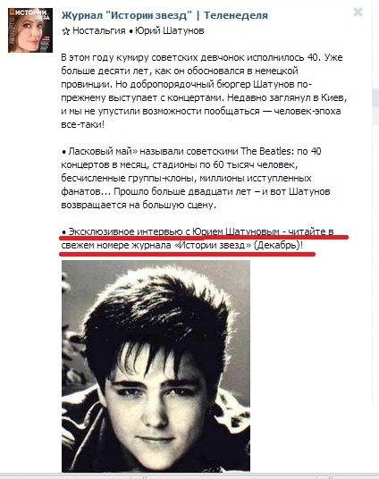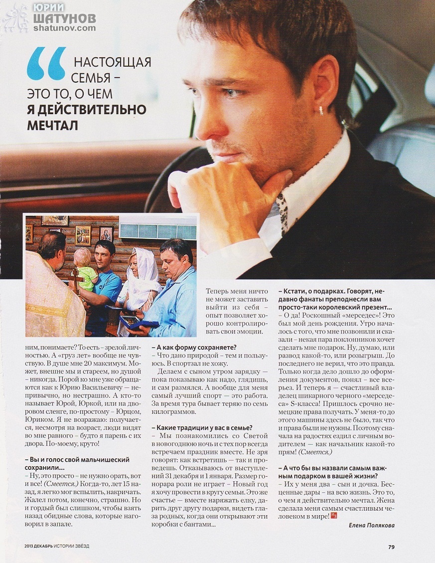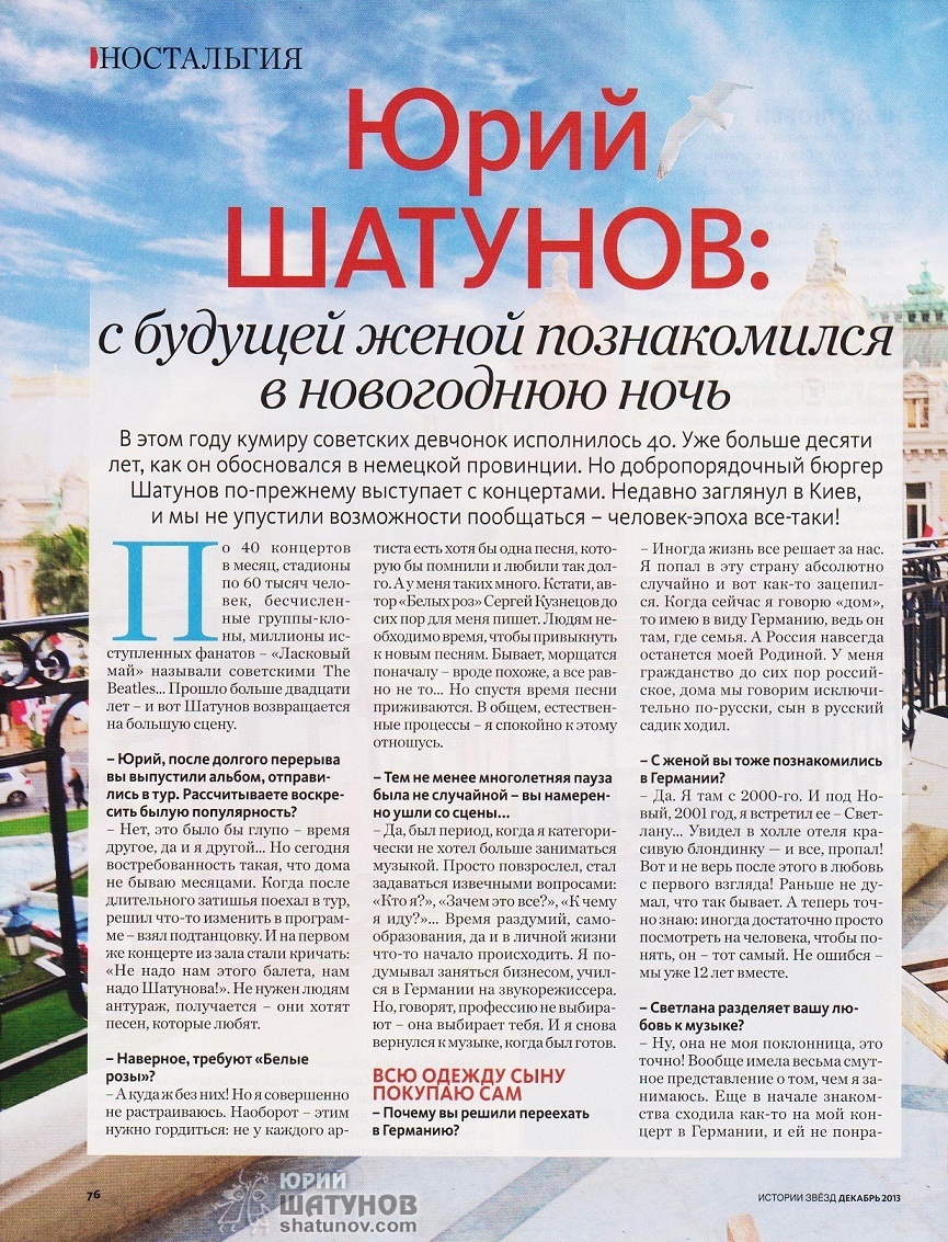 Сама статья ЮРИЙ ШАТУНОВ: с будущей женой познакомился в новогоднюю ночь. стр.76-79. Хорошо что о Юрие продолжают писать в Украинских газетах и журналах после того как был тур это крутяк! Очень трогательная статья о семье Юрия Шатунова! Хочется сказать продолжение следует! Очень приятно что столько внимания в наше прессе Легендарному певцу! Значит ждём ещё раз приезда Юрия в Украину я знаю одно что приезд ещё будет и не один раз)